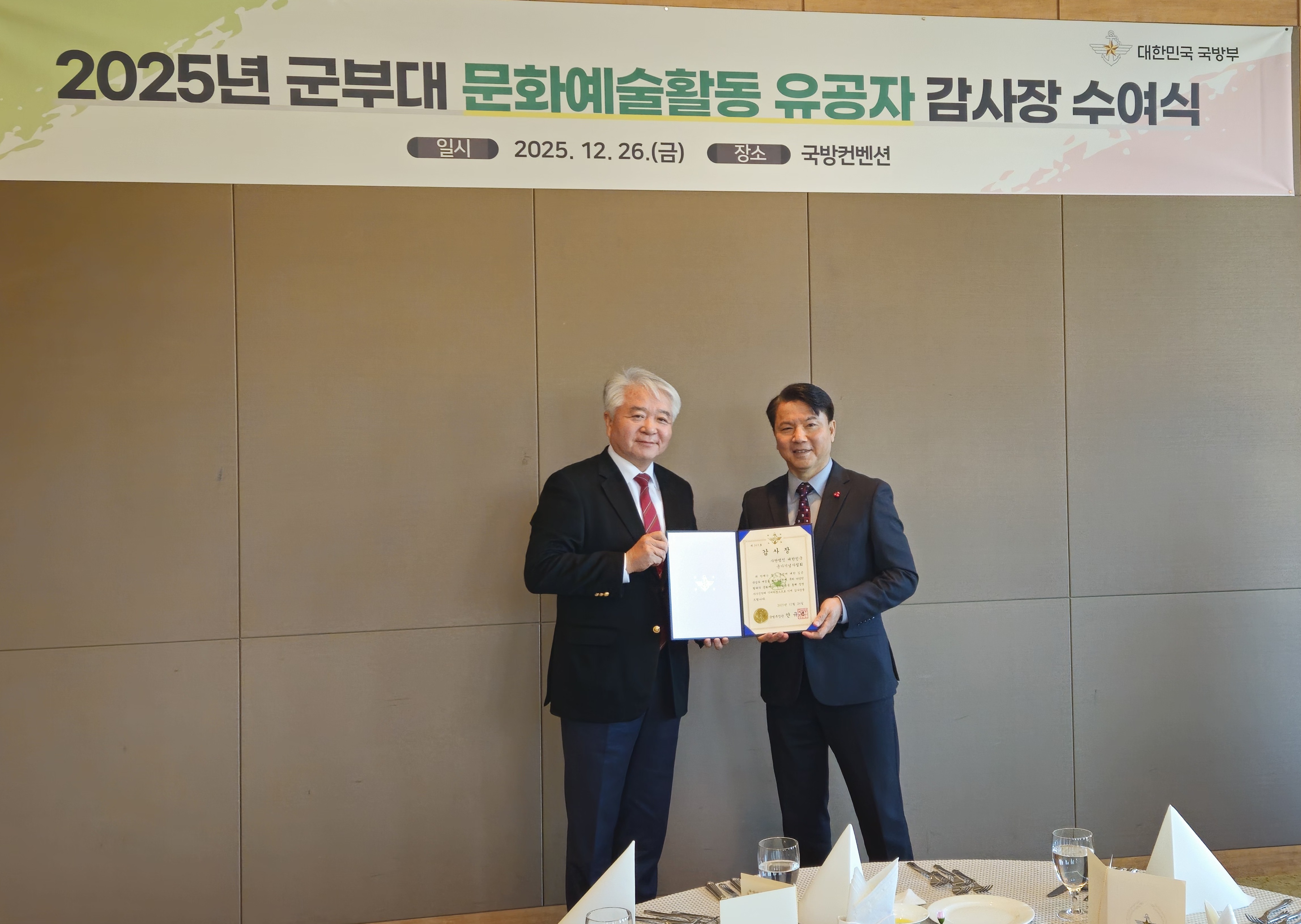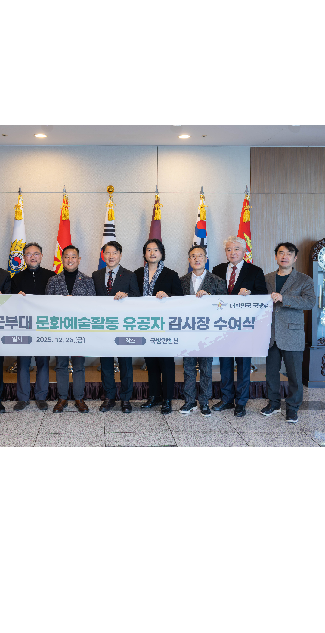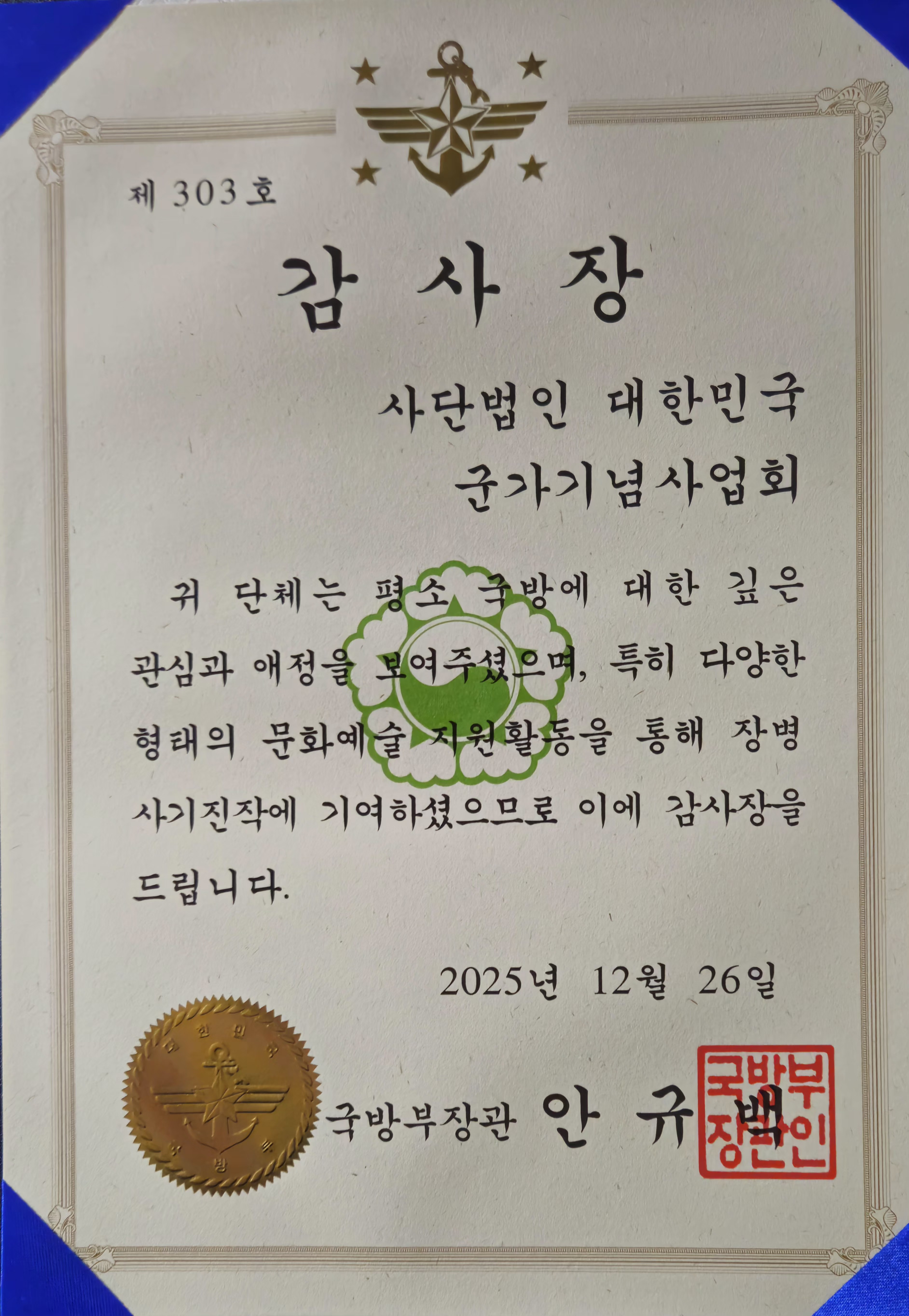 대한민국 군가기념사업회가 2025년 군부대 문화예술활동 유공자 감사장을 수여 받았습니다.